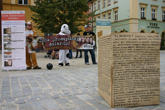 Muzyczną oprawę happeningu zapewniał grający nieopodal hard-rockowe szlagiery sobowtór Franka Zappy. :) Spotkaliśmy również ekipę z warszawskiej kawiarni Cykloza (w której notabene nie znajdziecie produktów pochodzących z przemysłowej hodowli – to u nich miała miejsce pokonkursowa wystawa plakatów) oraz Baśkę z Klatki B – początkowo nie była zainteresowana, lecz kilka zdjęć przyniesionych przez Wrocławiaków wzbudziło w niej drzemiące pokłady empatii.